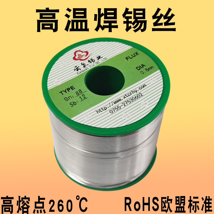 高温焊锡丝,成分配比Sn88Sb12,熔点高达260℃,该款锡线符合RoHS欧盟标准,0.8/1.0/1.2/1.5/2.0mm线径均可定制。广泛应用于对焊接温度较高的电子元器件、线路板封装领域,适用于手工焊工艺。